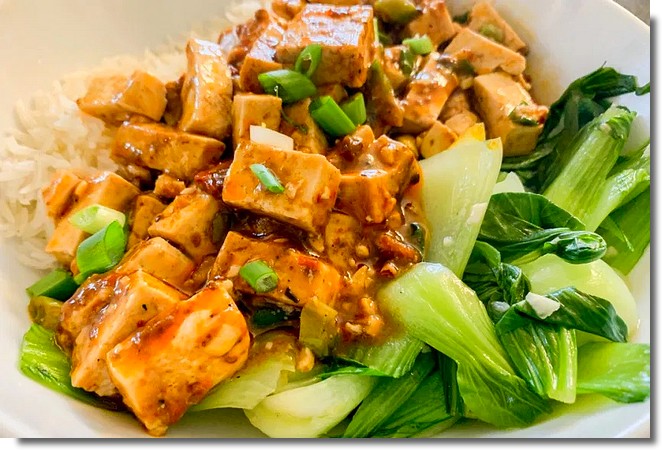 Les cuisiniers chinois marient aisément tofu et viandes dans leurs différentes recettes, car leurs qualités se répondent. Cependant le tofu, connu pour son apport en protéines, remplace avantageusement les produits animaux. Les végétariens et les végétaliens peuvent se régaler en dégustant un mapo tofu sans viande. Celui-ci varie selon les chefs, il peut être agrémenté de champignons. L’important est qu’il soit bien relevé. La pâte de haricot noir fermenté, relevé à l’ail et au piment en est la condition… et le piquant. Ce plat complet est riche en nutriments. Le feu est calmé par le riz parfumé. le repas est parfaitement équilibré. Il est réconfortant après une journée bien remplie.